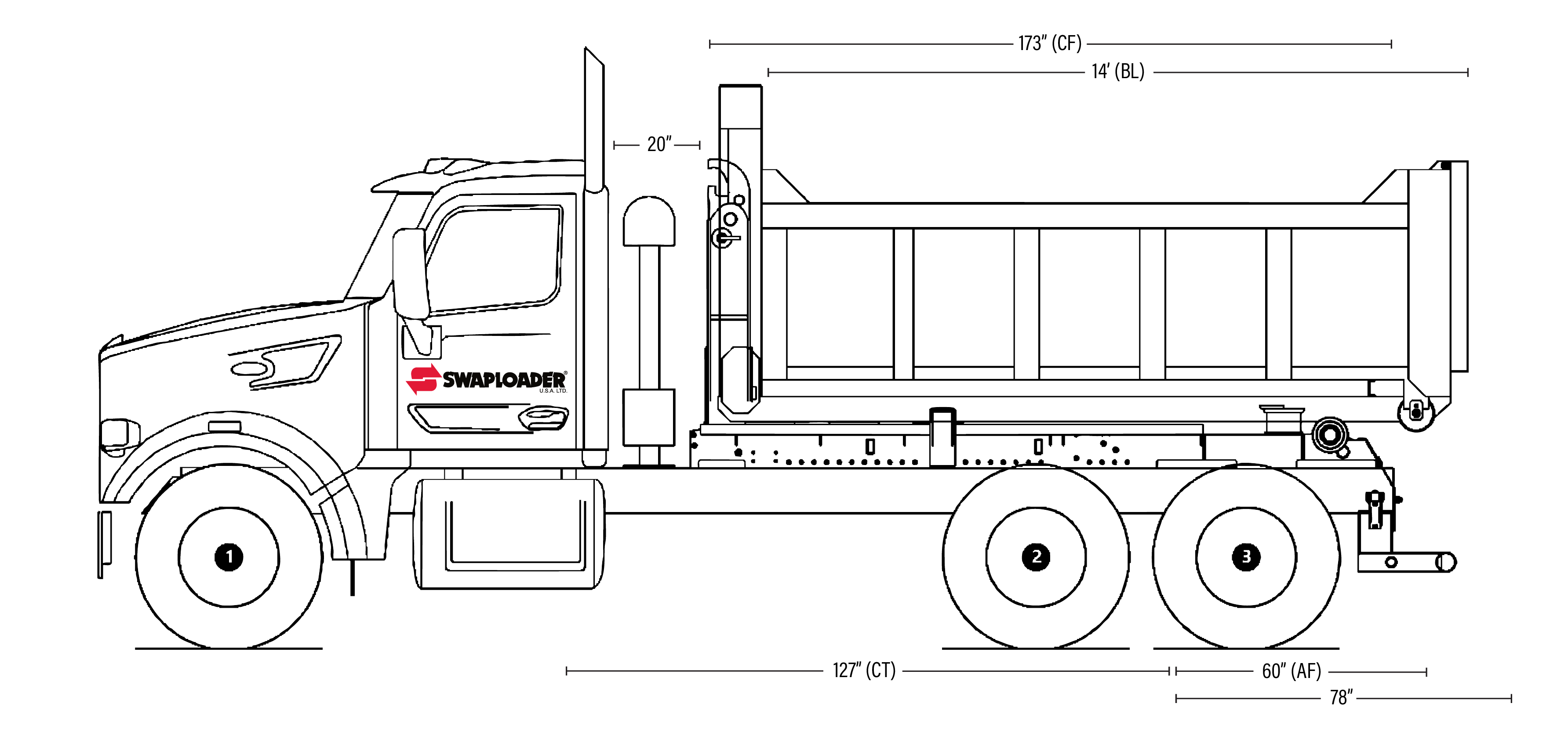 | CAB-TRUNNION DIMENSIONS* (Tandem Axle) | 103″ – 115″ |
