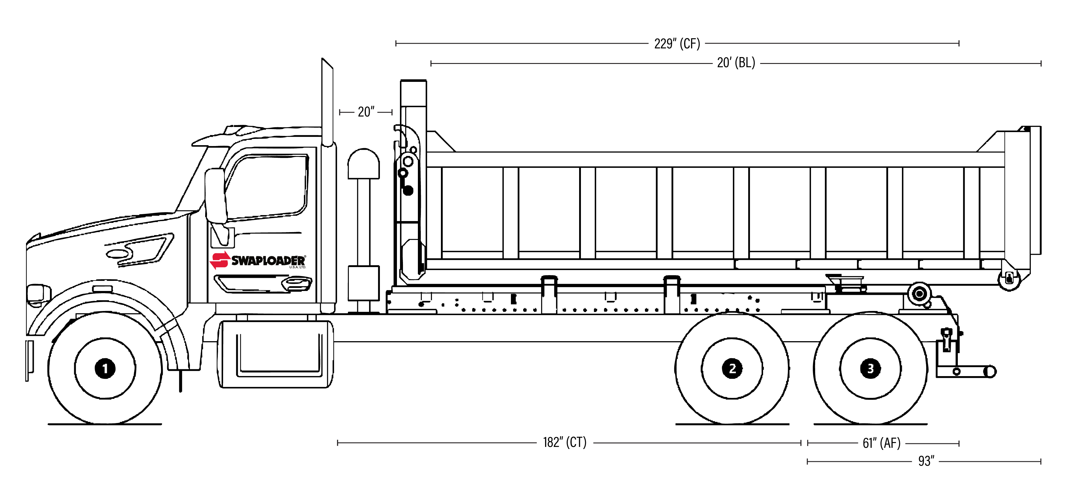 | CAB-TRUNNION DIMENSIONS* (Tandem Axle) | 158″ – 170″ |