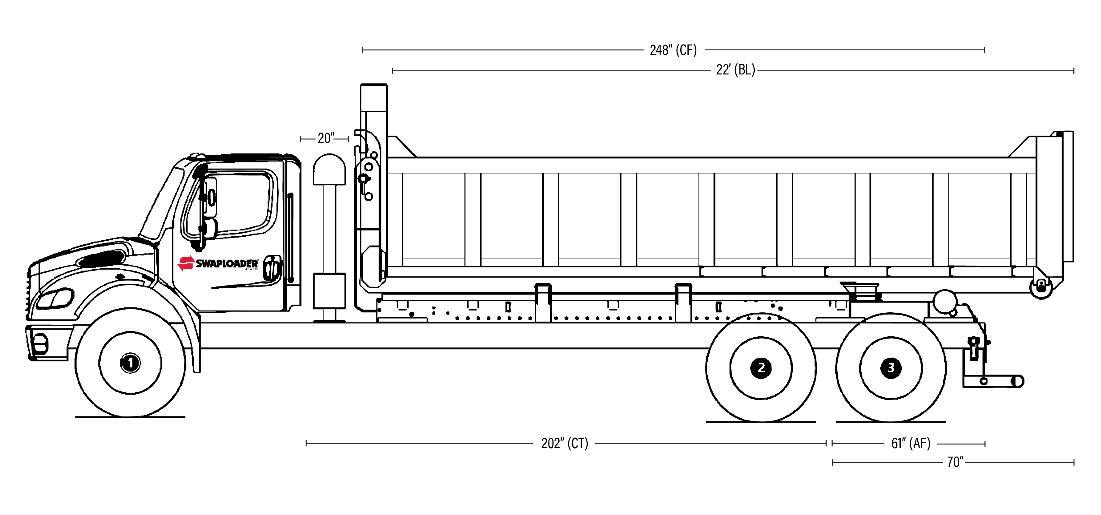 | CAB-TRUNNION DIMENSIONS* (Tandem Axle) | 178″ – 190″ |